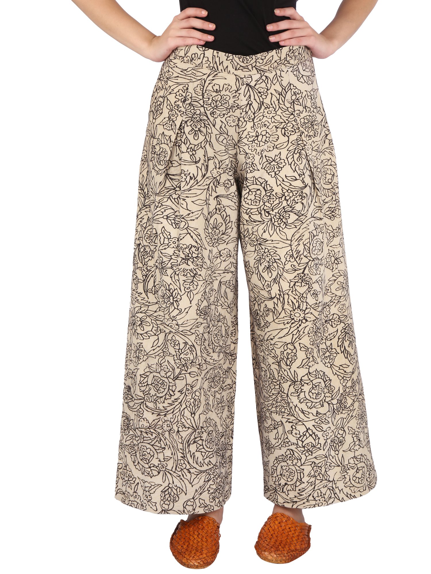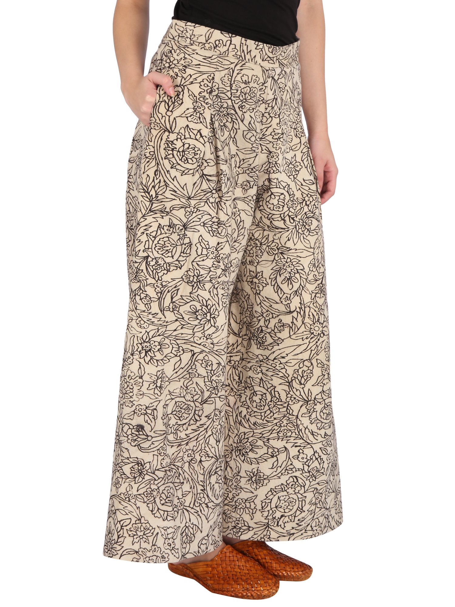 Beige denim pants with regular flare and back elastic. Featuring hand painted kalamkari from Srikalahasti, Andhra Pradesh. Motifs are inspired from Iznik tiles of Istanbul.