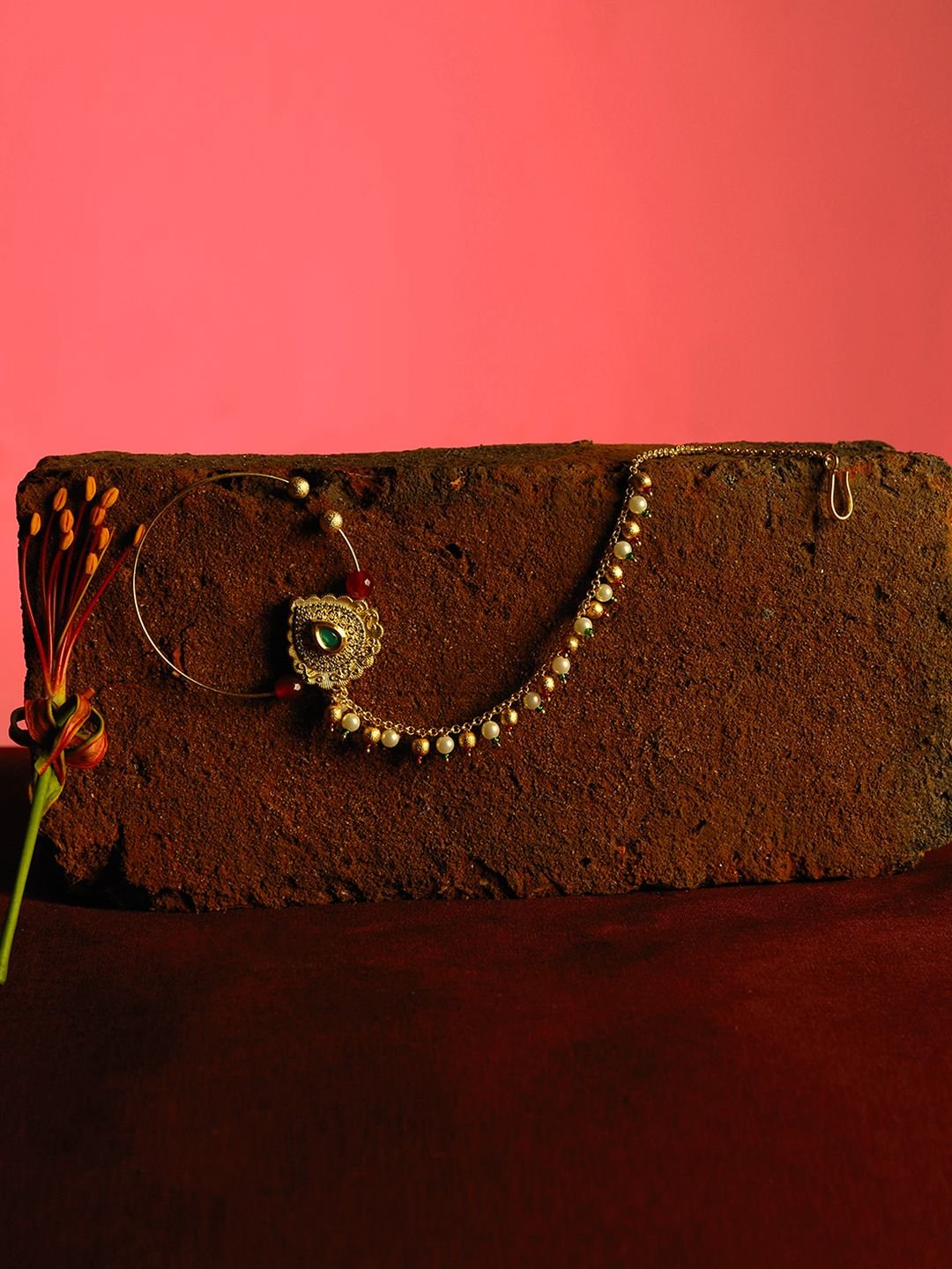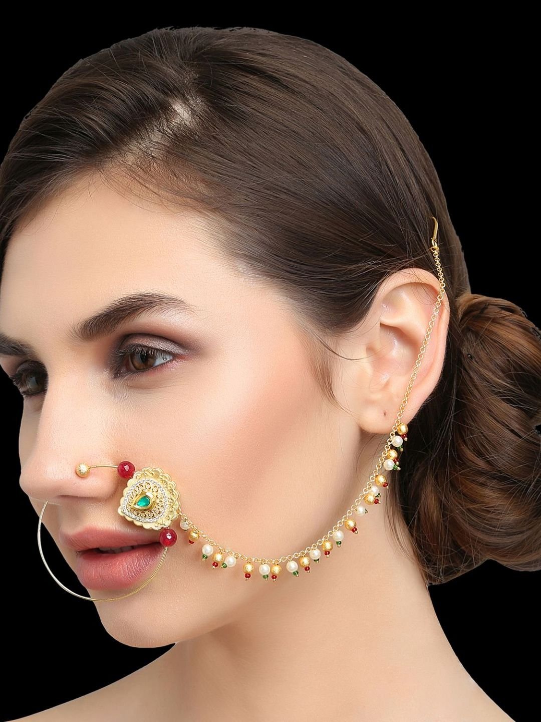 • Women’s Real Look, Micro Gold Polished Semi Precious Kundan & Pearl Nath/ Nose Pin/Nose Ring designed by Yosshita & Neha.