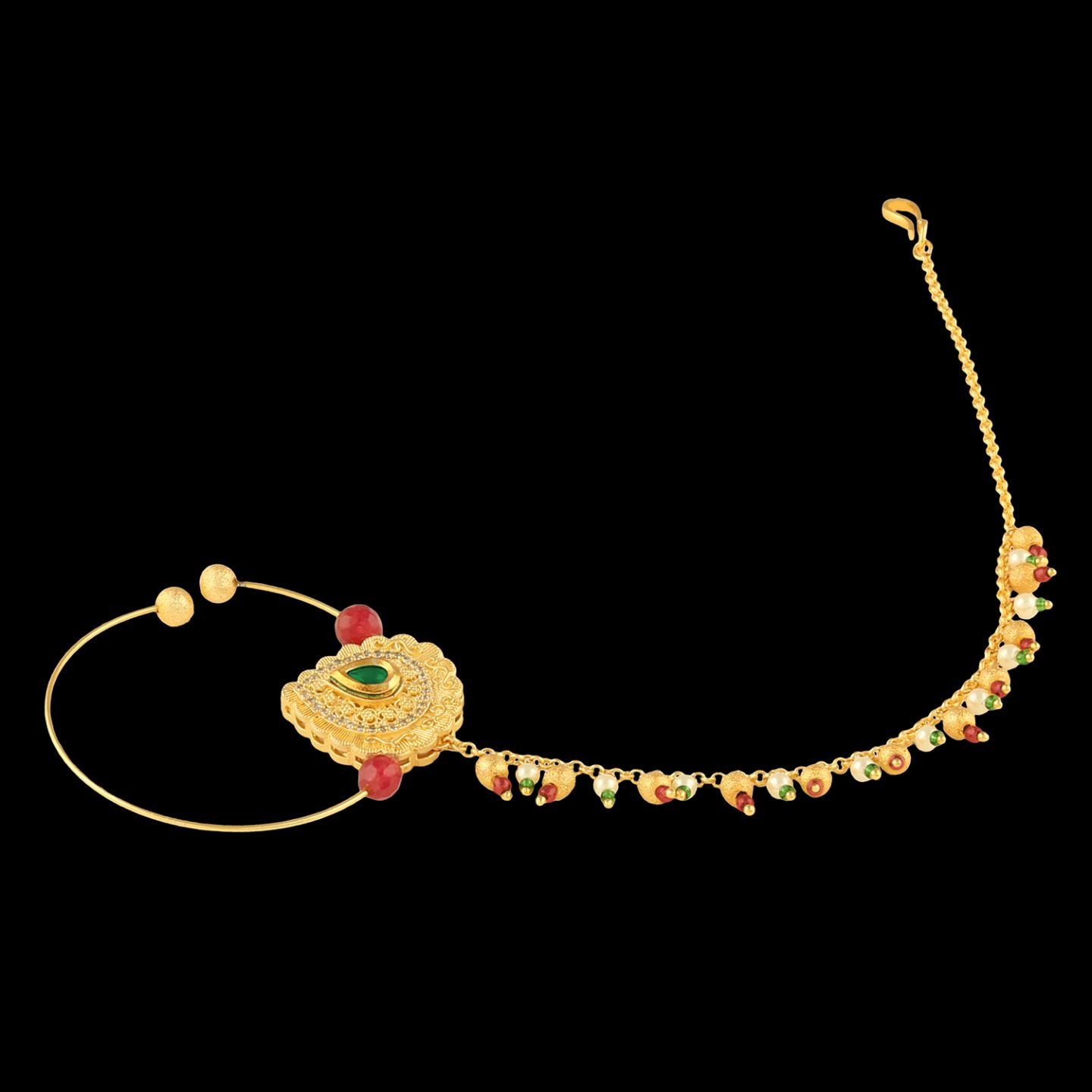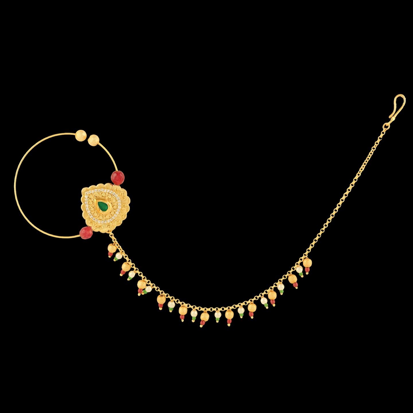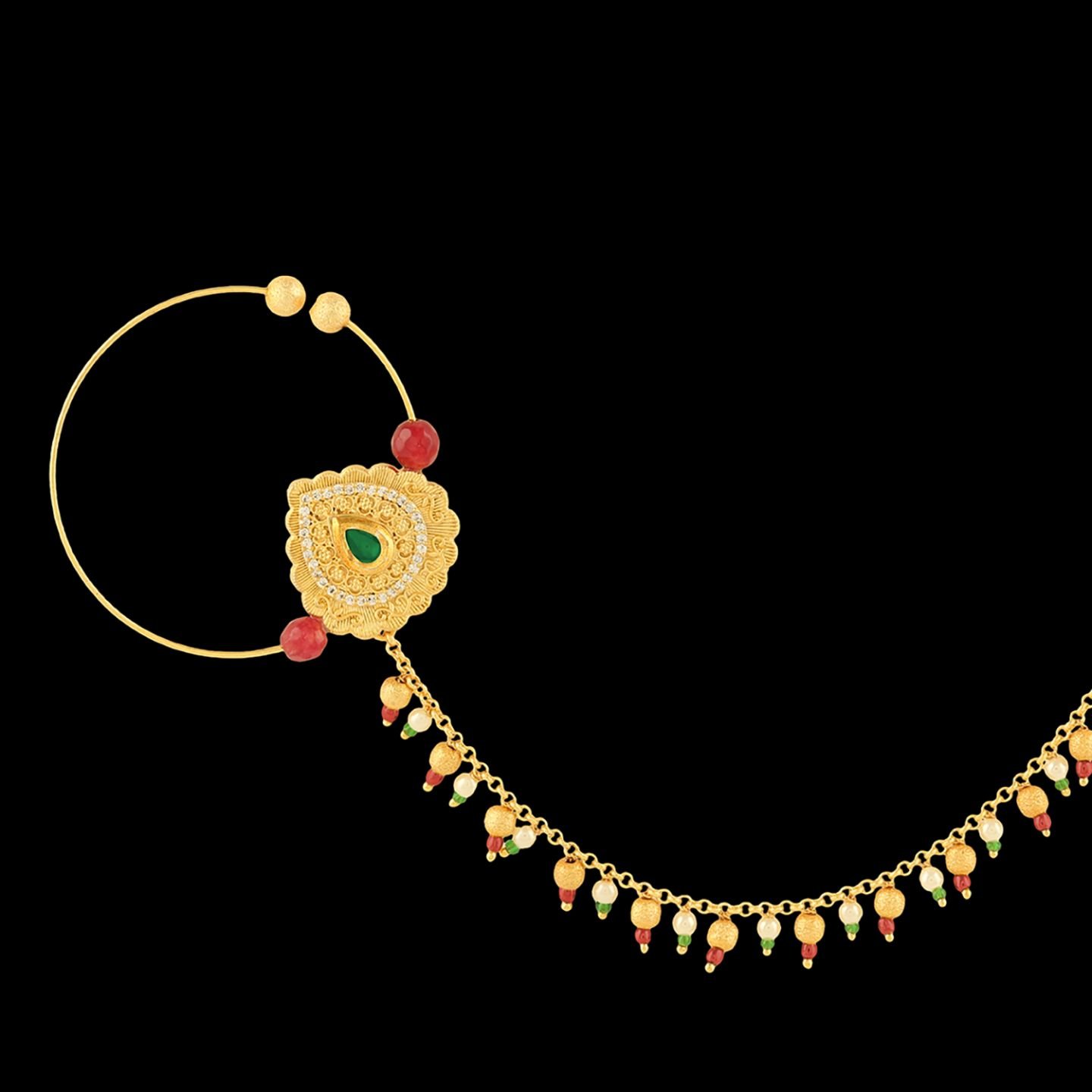 •Comes with Micro Gold Polished & studded with White, Red & Green Coloured Semi Precious Kundan & a strand of Pearl.