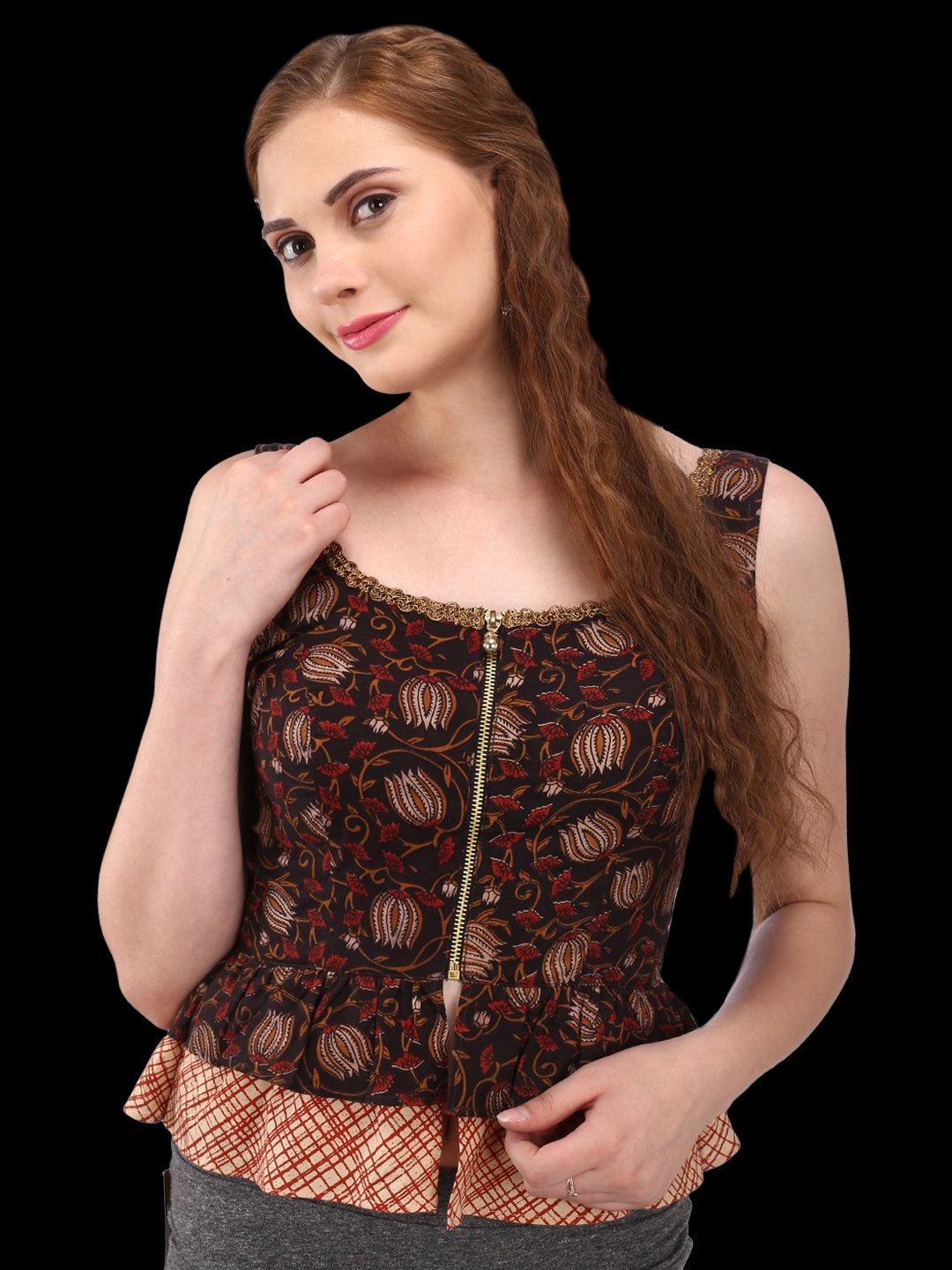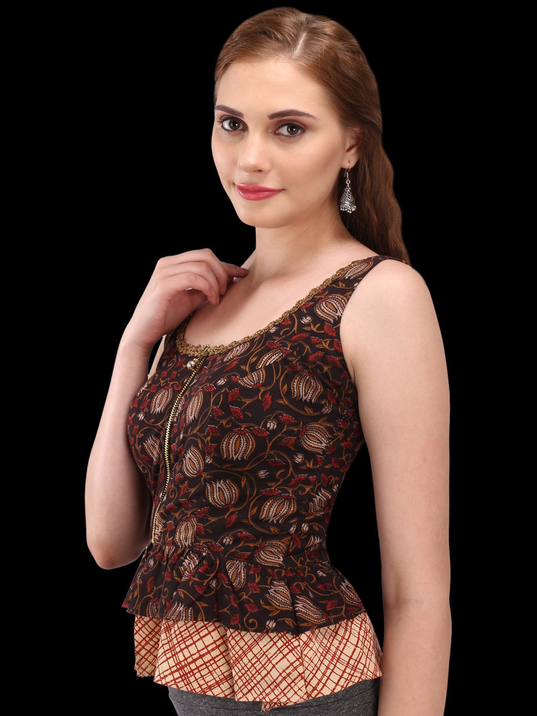 Hand block Brown, Maroon, Buff and Black Kalamkari Print Cotton peplum style blouse
