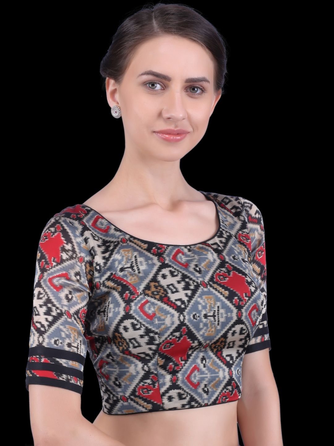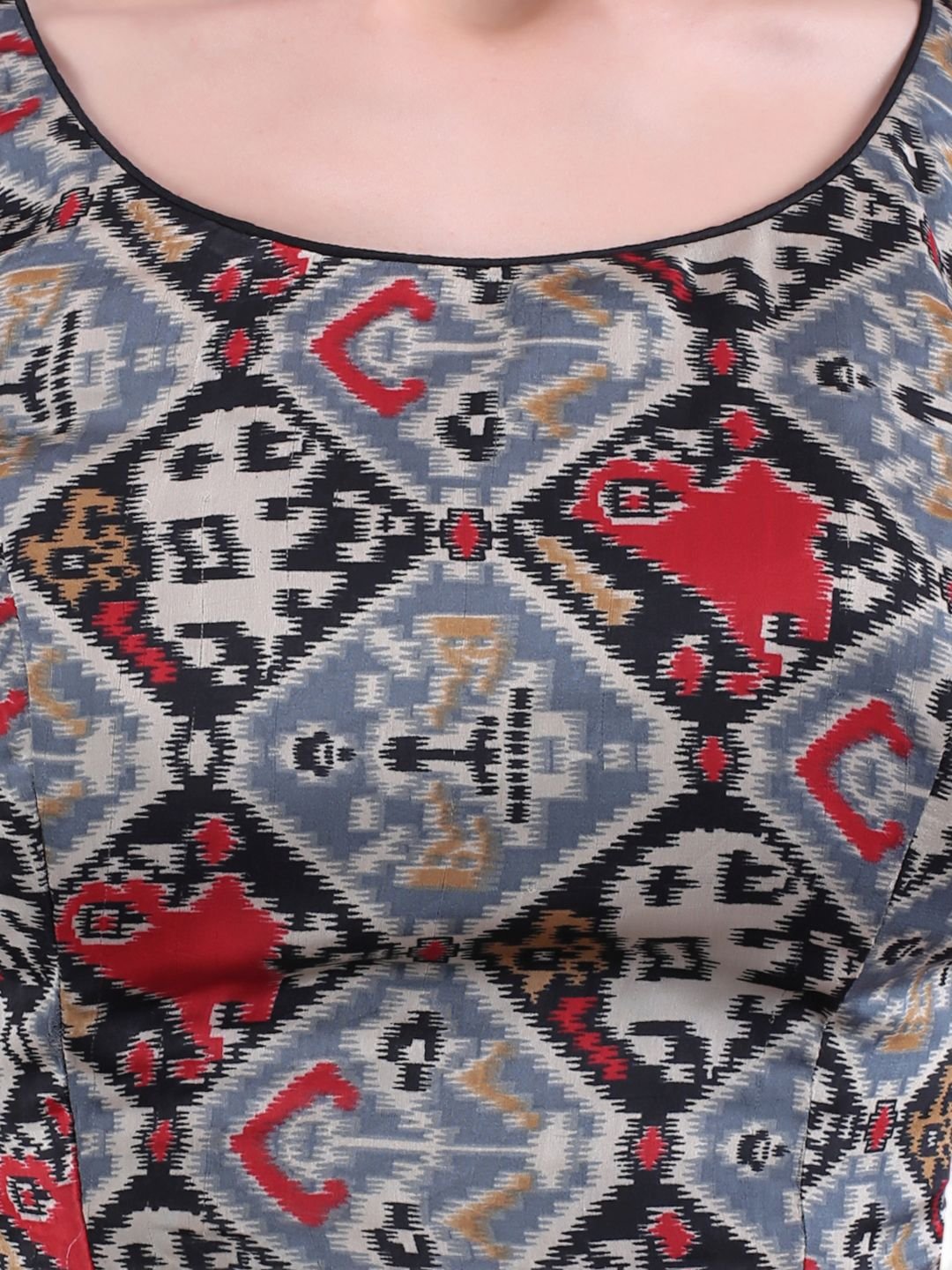 1 Bedecked with a captivating Patola inspired print in combination with black piping and tie-up back, this art silk blouse showcases the mastery of traditional craftsmanship.