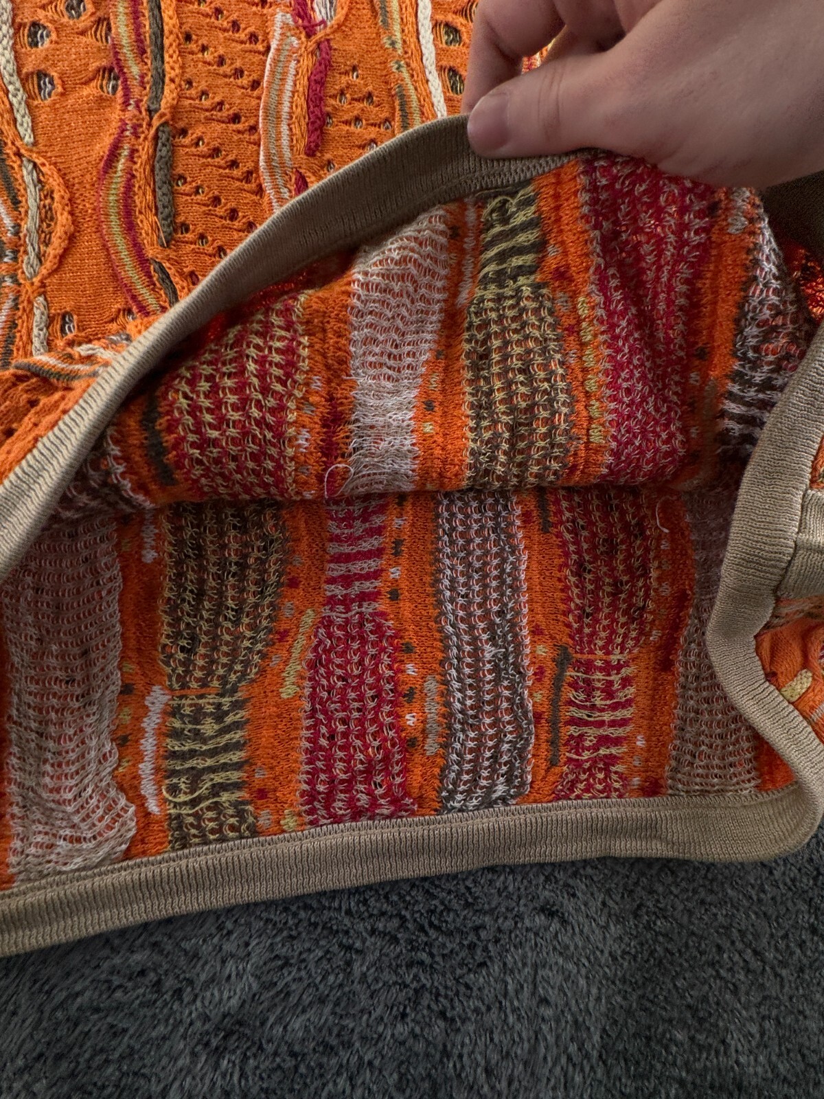 This COOGI Australia short sleeve knit sweater pullover features a collared design in orange. It is in good condition overall, with noted wear: minor stains, a missing top button (a spare button is attached on the inside), and an area on the front where white knit netting has come off, leaving a cluster of holes. Check the listing for details on size, materials, and measurements. Free shipping is included, and the item will be packed and shipped promptly according to the seller’s handling time.