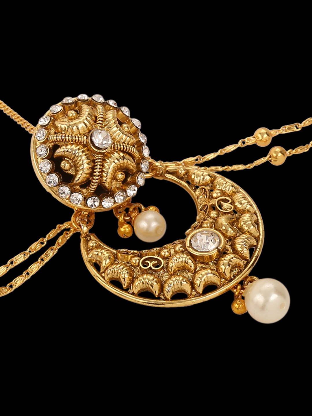 • Womens Real Look, Traditional Micro Gold Polished Semi Precious Stones & Pearl Damini/Maang Tikka/ Matha patti/ Tikka/Borla designed by Yosshita & Neha.