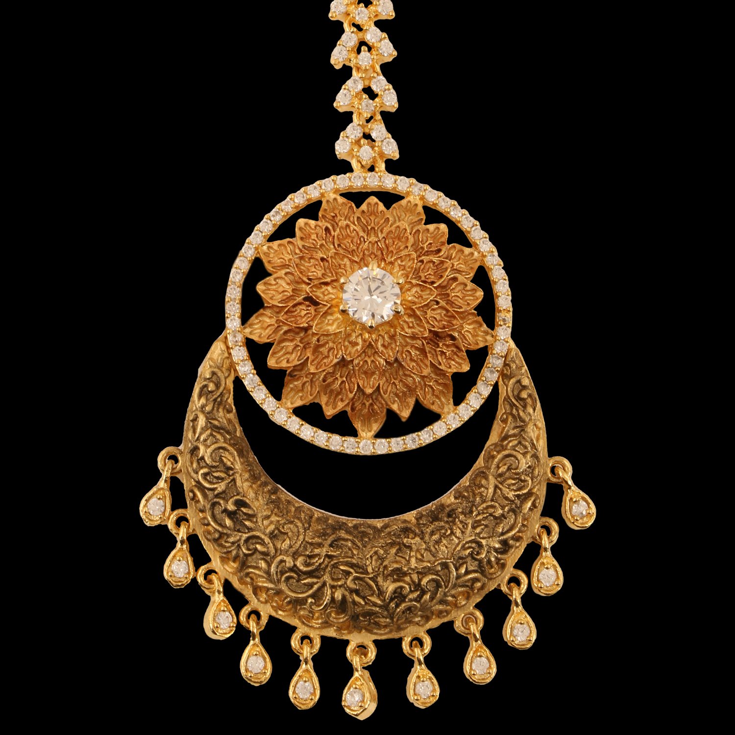 • Womens Real Look, Traditional Micro Gold Polished Semi Precious stones & Antique finish Maang Tikka/ Matha patti/ Tikka/Borla designed by Yosshita & Neha.